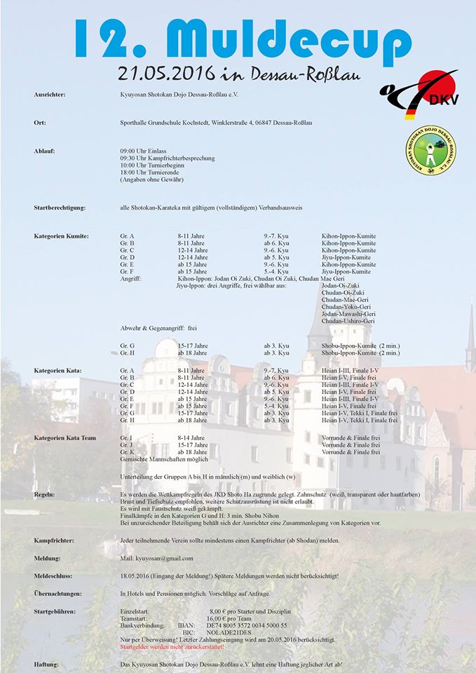 | Am 21.05. findet der diesjährige Mulde-Cup in Dessau statt. Ihr findet im Dojo demnächst eine Ausschreibung sowie die Anmeldung. Bitte tragt euch bis zum 17.05. in die Liste im Dojo ein und überweist die Startgebühren ebenfalls bis zum 17.05. auf unser Vereinskonto bei der DKB (siehe SEPA-Umstellung).