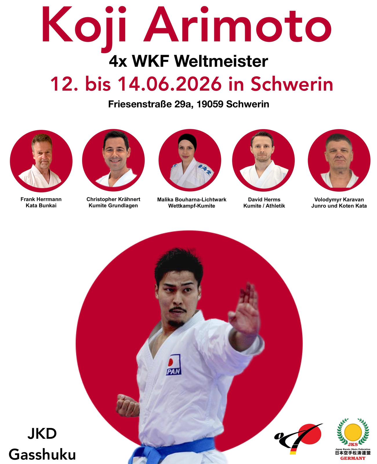 Vom 12. bis 14. Juni 2026 findet das nächste JKD Gasshuku in Schwerin statt. Wir freuen uns, in diesem Jahr Sensei Koji Arimoto (4-facher WKF-Weltmeister) begrüßen zu dürfen. Das Trainerteam setzt sich darüber hinaus zusammen aus: